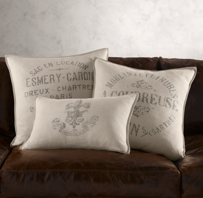 After Cory & I redid the table for our "office" I wanted to change up the look of the room. An easy and inexpensive way to do that was to change the pillows for the sofa. I have been seeing burlap pillows around for a while now and I always really like them. Neiman Marcus has some beautiful ones right now as does Restoration Hardware but unfortunately they are pretty pricey. Here are some from Restoration Hardware.